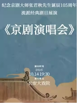长安大戏院10月14日《纪念京剧大师张君秋先生诞辰105周年京剧演唱会》 时间:2025.10.14 周二 19:30 场馆:北京市 | 长安大戏院 票价:180/280/3800/480/580 微信订票:18515362586 电话订票:010-66552100,010-66552258